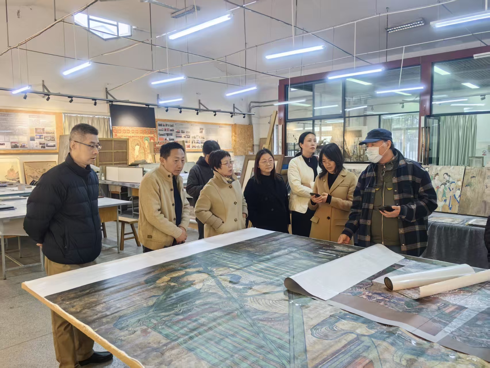 理论学习结束后,会员们前往江苏理工学院传统壁画研究所参观学习。在民建会员代表、艺术设计学院白翔老师的介绍下,会员代表们参观了“流失海外壁画复制项目”作品,体验了简易壁画的制作技艺,深入了解了大型经典复制作品背后的历史文化内涵和独特工艺技法,亲身感受了中华优秀传统文化的魅力。(图文/民建江苏理工学院支部 俞超;审核/叶霞 刘晓杰;编辑/邵丽珍)